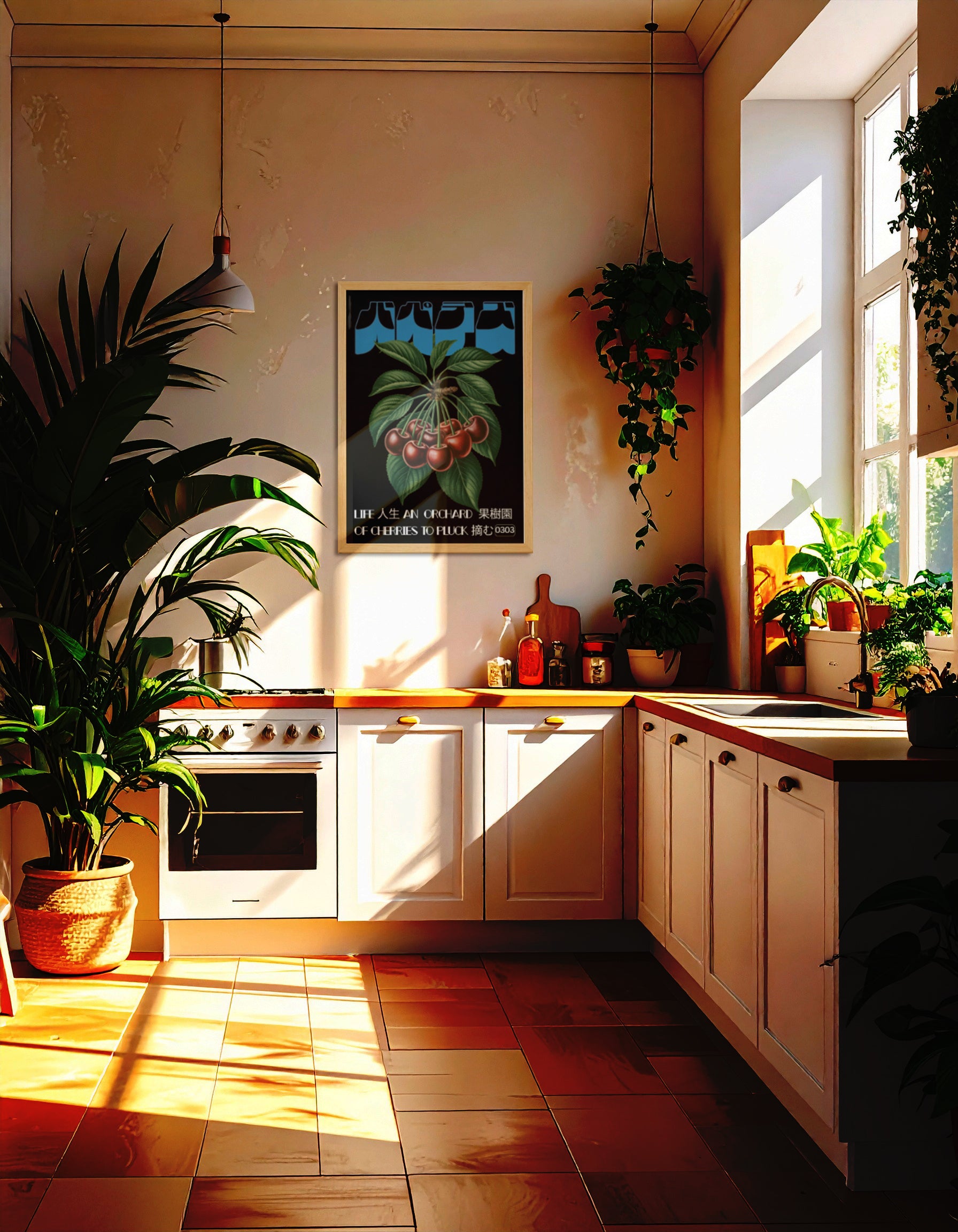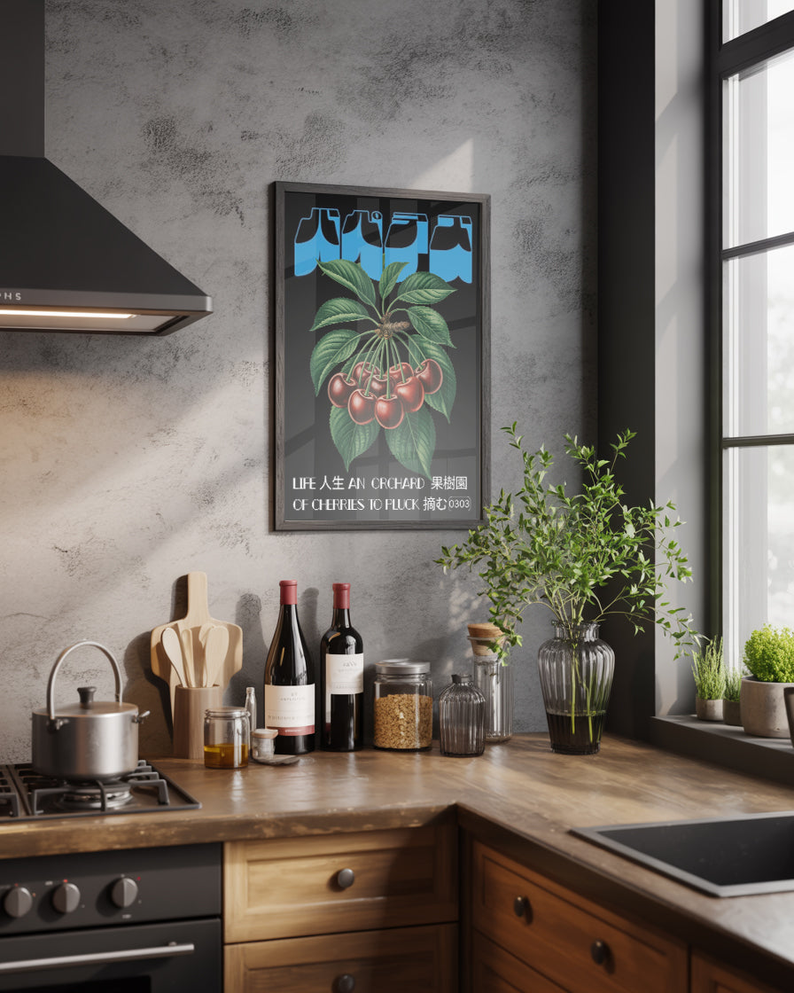 Elevate your space with the dark, dramatic contrast of the Black Cherry Orchard print. This piece sets a lush, realistic botanical illustration against a graphic black background, allowing the deep reds and subtle greens to pop with stunning intensity. It’s a sophisticated blend of natural beauty and graphic punch, making a chic statement in any modern living or dining area.