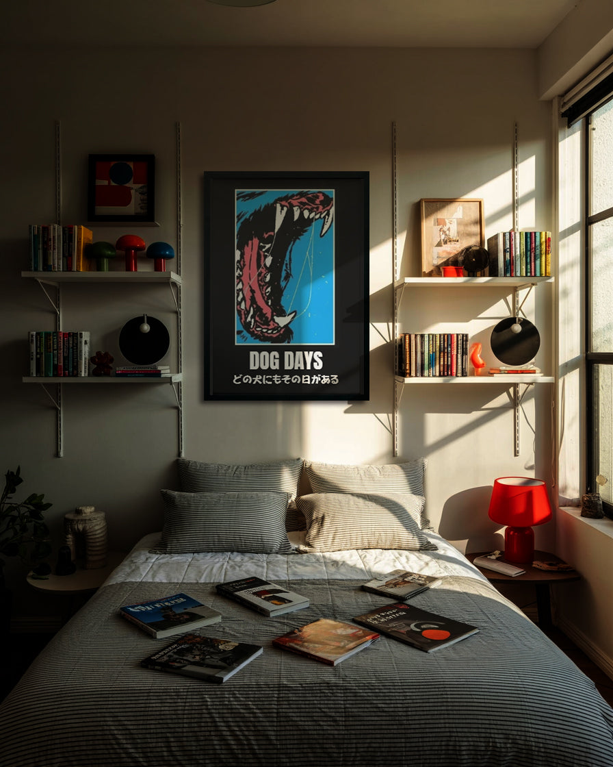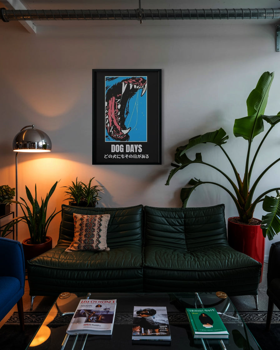 For the collector who appreciates art with a fierce edge and a powerful message. This "Dog Days" print is a raw, high-contrast illustration of pure ferocity set against a minimalist blue field. The stylized jaw and teeth are an unapologetic expression of passion, complemented by a philosophical message about destiny and patience.