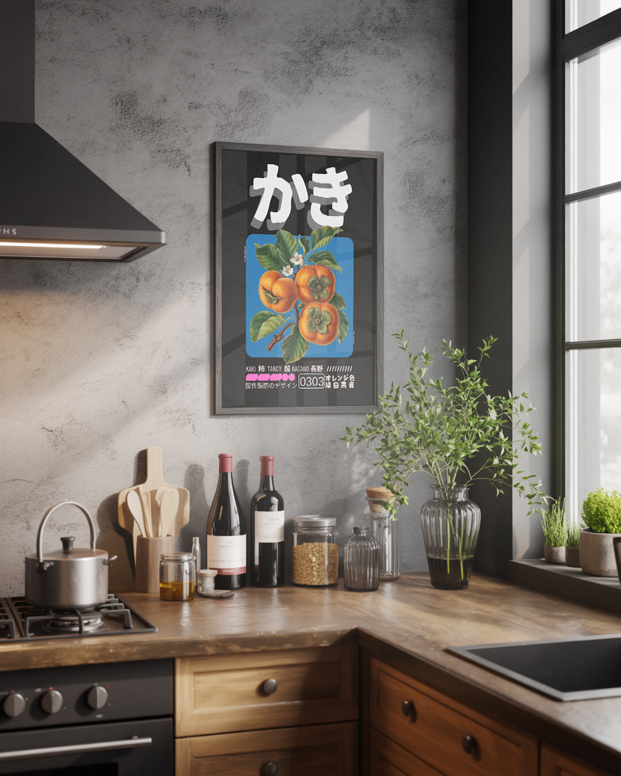 Ready to complete your curated culinary wall? This "Tangy Kaki" print pairs flawlessly with the Neon Yuzu and Amaou Strawberry, sharing the signature blend of vintage botanical illustration and audacious color blocking. The rich, harvest-orange fruit against the electric blue background creates a sophisticated, high-impact contrast that instantly elevates your dining or kitchen area.